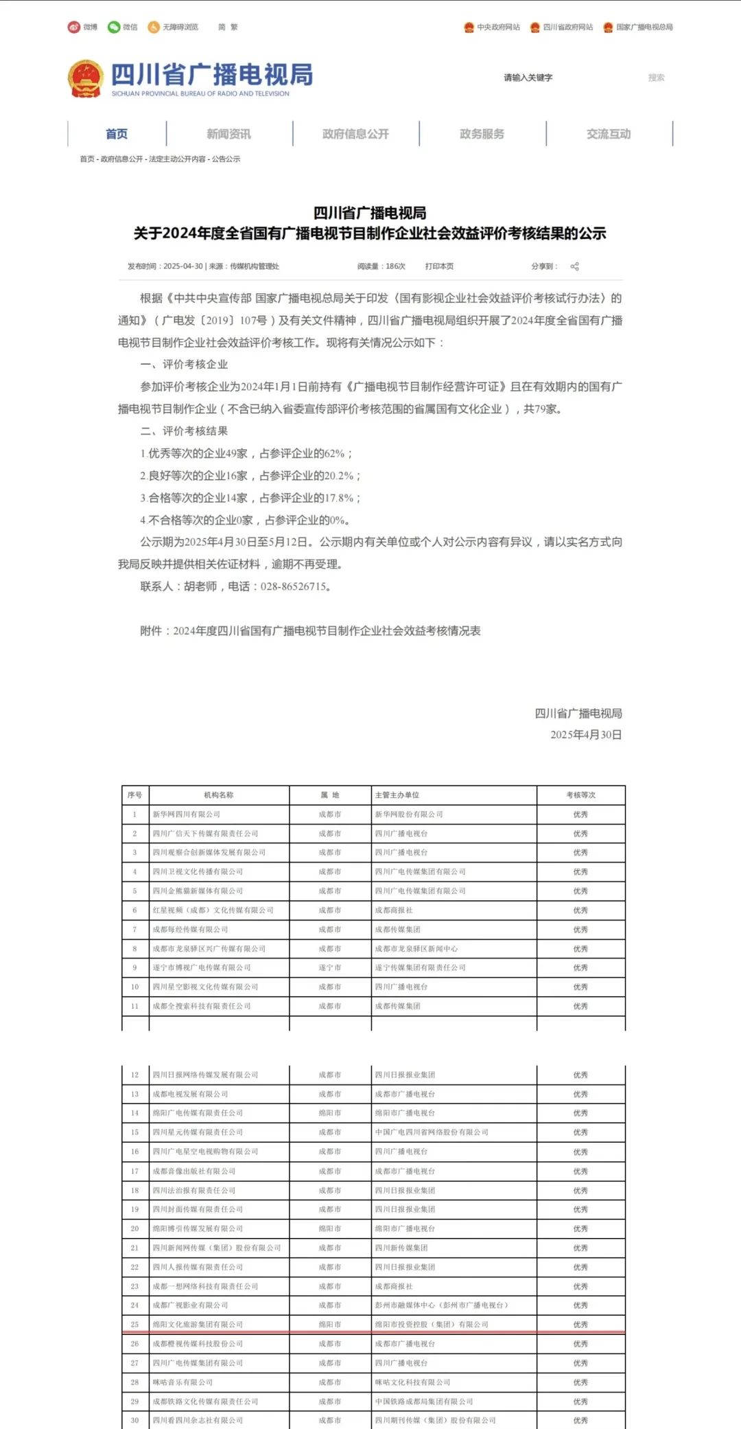 近日,四川省廣播電視局發(fā)布《關(guān)于四川省2024年度國(guó)有廣播電視節(jié)目制作企業(yè)社會(huì)效益評(píng)價(jià)考核結(jié)果的通報(bào)》,綿陽(yáng)文旅集團(tuán)憑借突出的社會(huì)效益表現(xiàn),連續(xù)四年獲評(píng)“優(yōu)秀”等次,彰顯了綿陽(yáng)文旅集團(tuán)在內(nèi)容創(chuàng)作、社會(huì)影響力及履行社會(huì)責(zé)任方面的持續(xù)引領(lǐng)作用。